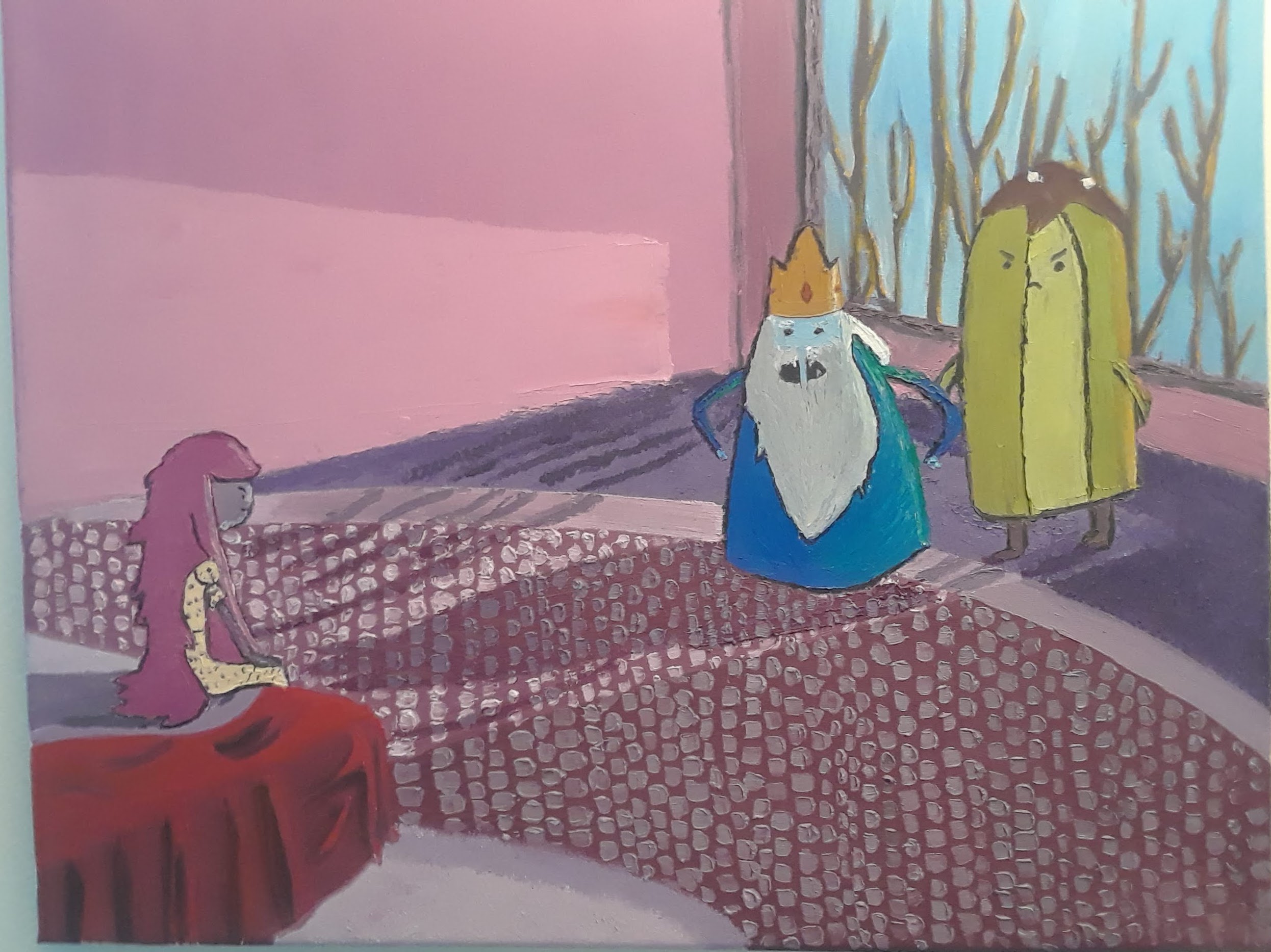 This is a version of a scene from the Cartoon Network show Adventure Time featuring Princess Bubblegum, the Ice King, and a banana guard. Oil paint on canvas, 20"x16", 2020Tony And His Gang