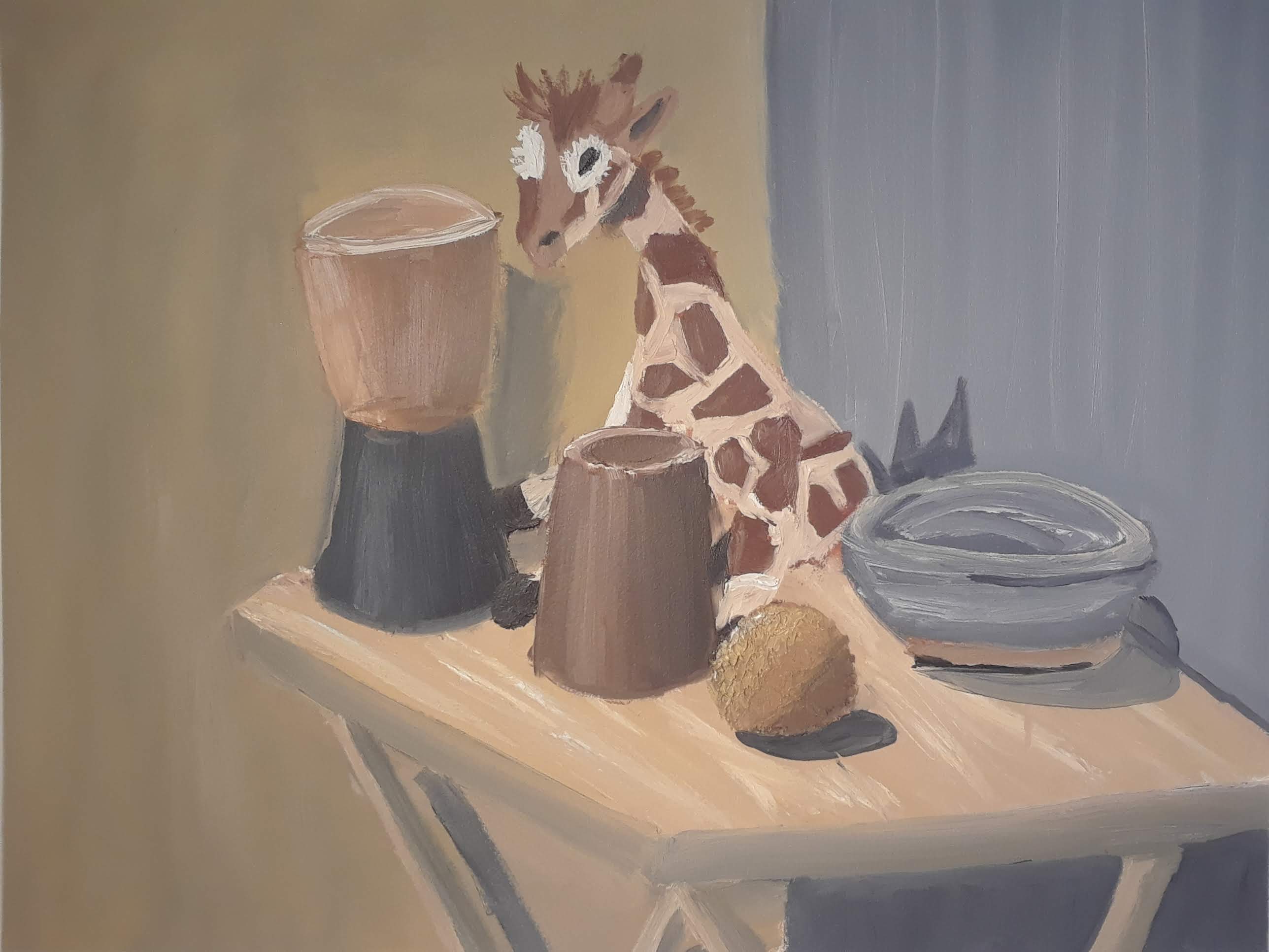 Tony the stuffed giraffe is featured in this still life. Oil paint on oil paper, 19" x "15", 2020Climb High, Fall Softly
