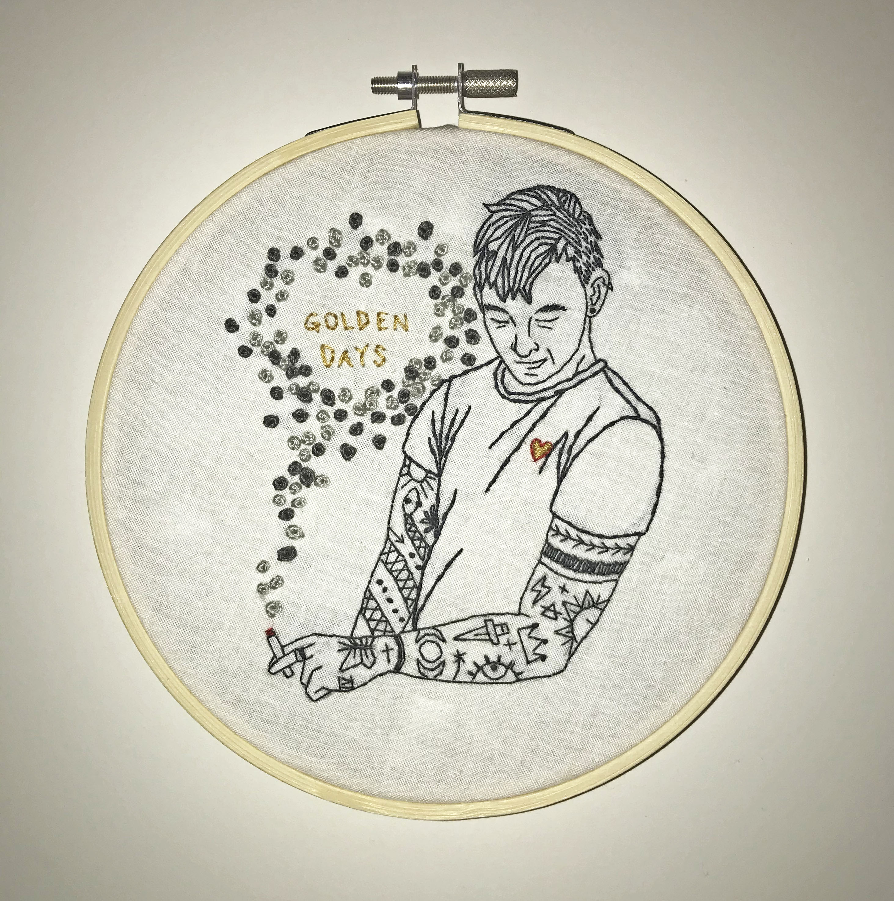 Portrait of a young man covered in tattoos made with fabric and embroidery floss, 6" diameter.