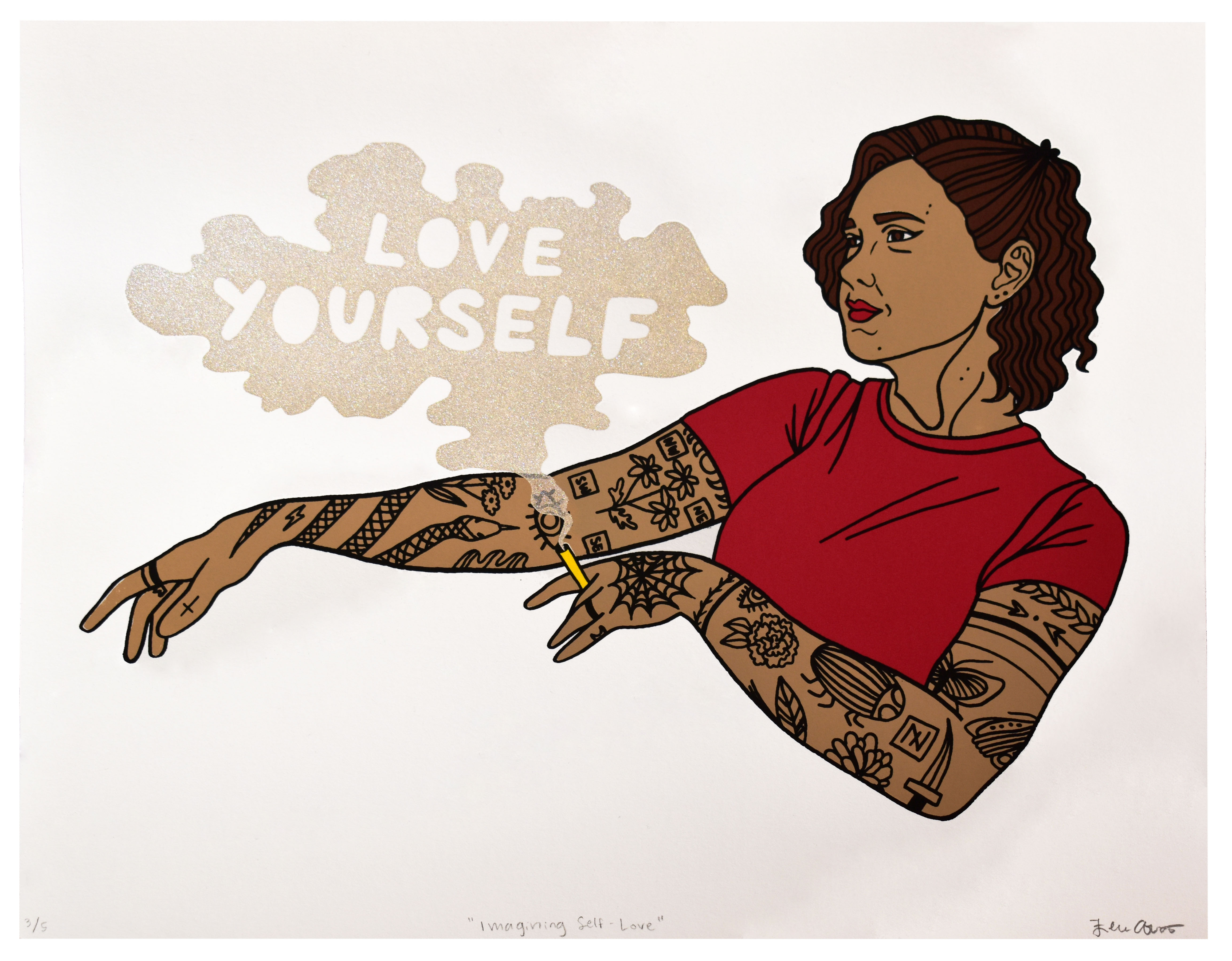 Self-portrait silkscreen print made with hand-drawn vellum & rubylith films, 11x14".Golden Days: