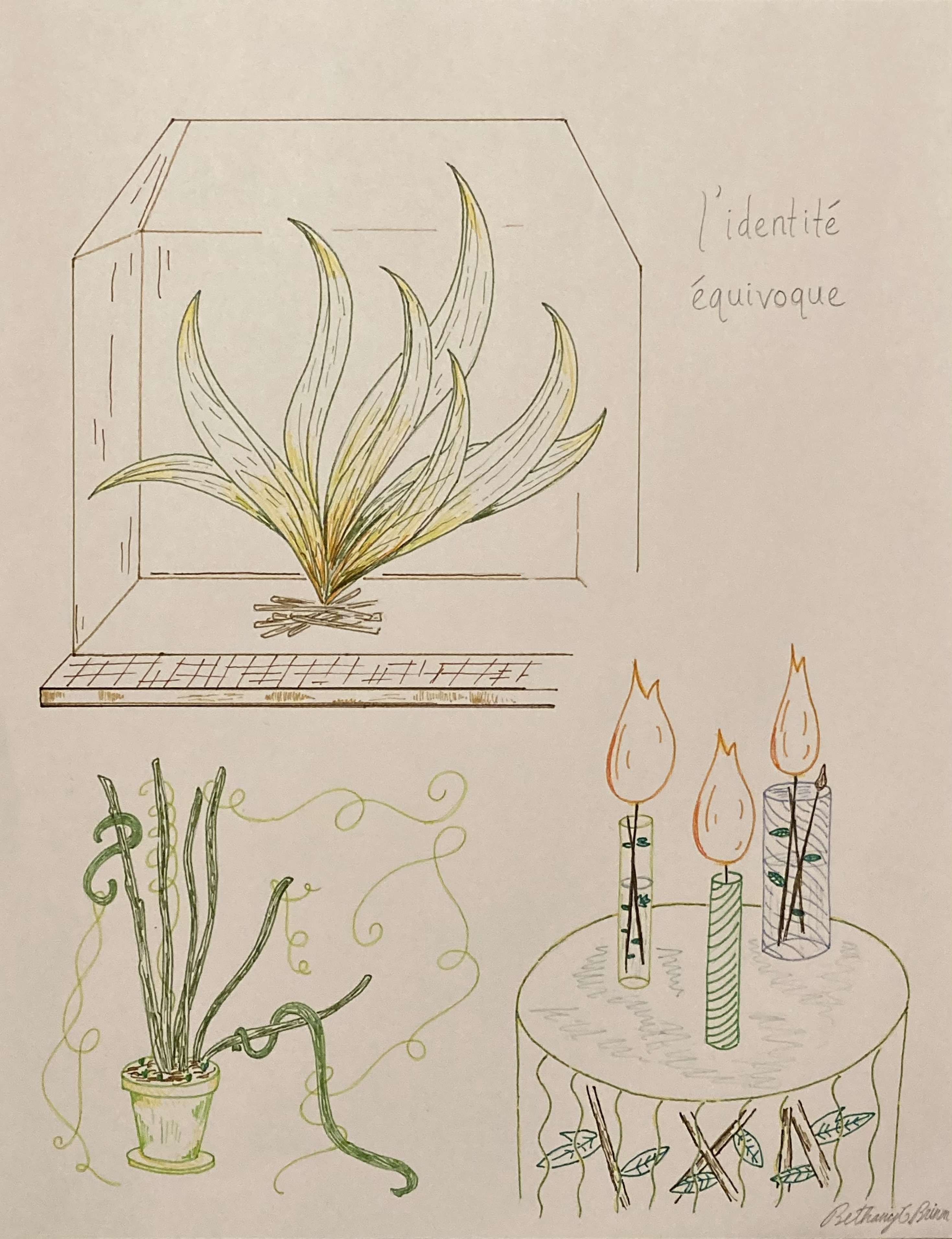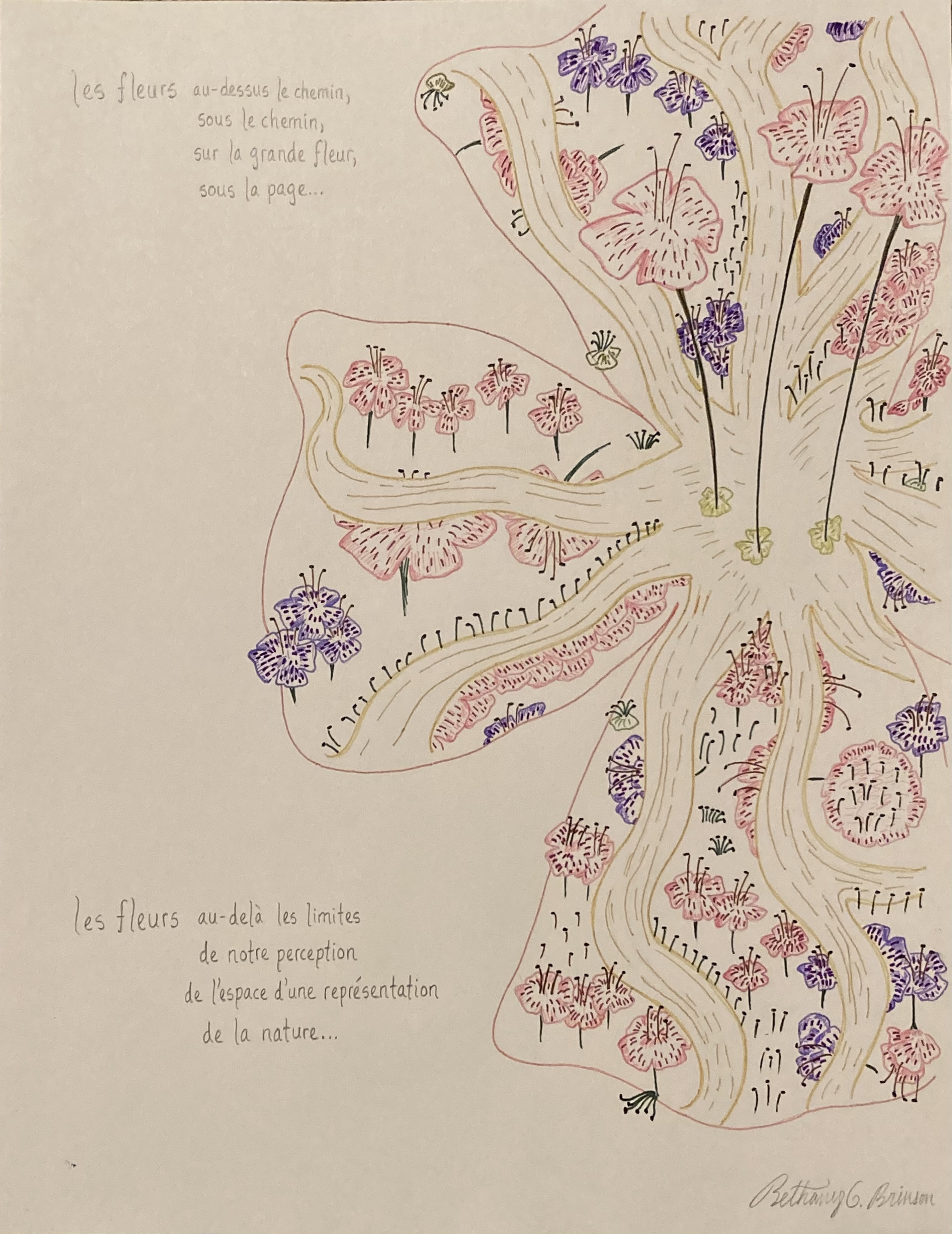 Fractal Flowers: In this 8.5x11 drawing with colored pens and pencil, accompanied by a few poetic reflections on the side, I sought to evoke several layers of perception, in self-similar (i.e. fractal) patterns: the single all-encompassing large flower is "under" the page, and the lines branching all over the flower hold a dual identity as both a walkable path and the natural lines of the flower; the flowers scattered in the spaces as well as "under" the path further play with the viewer's sense of depth and space.L'identité équivoque (The Ambiguous Identity): As the title suggests, the theme of this 8.5x11 drawing with colored pens and pencil is "ambiguous identity"; one of the scenes could be a bright tropical plant or a fireplace; another scene could represent flowers in vases, or candles; the other scene seems at first glance like an ordinary houseplant, but it seems uncannily animated.