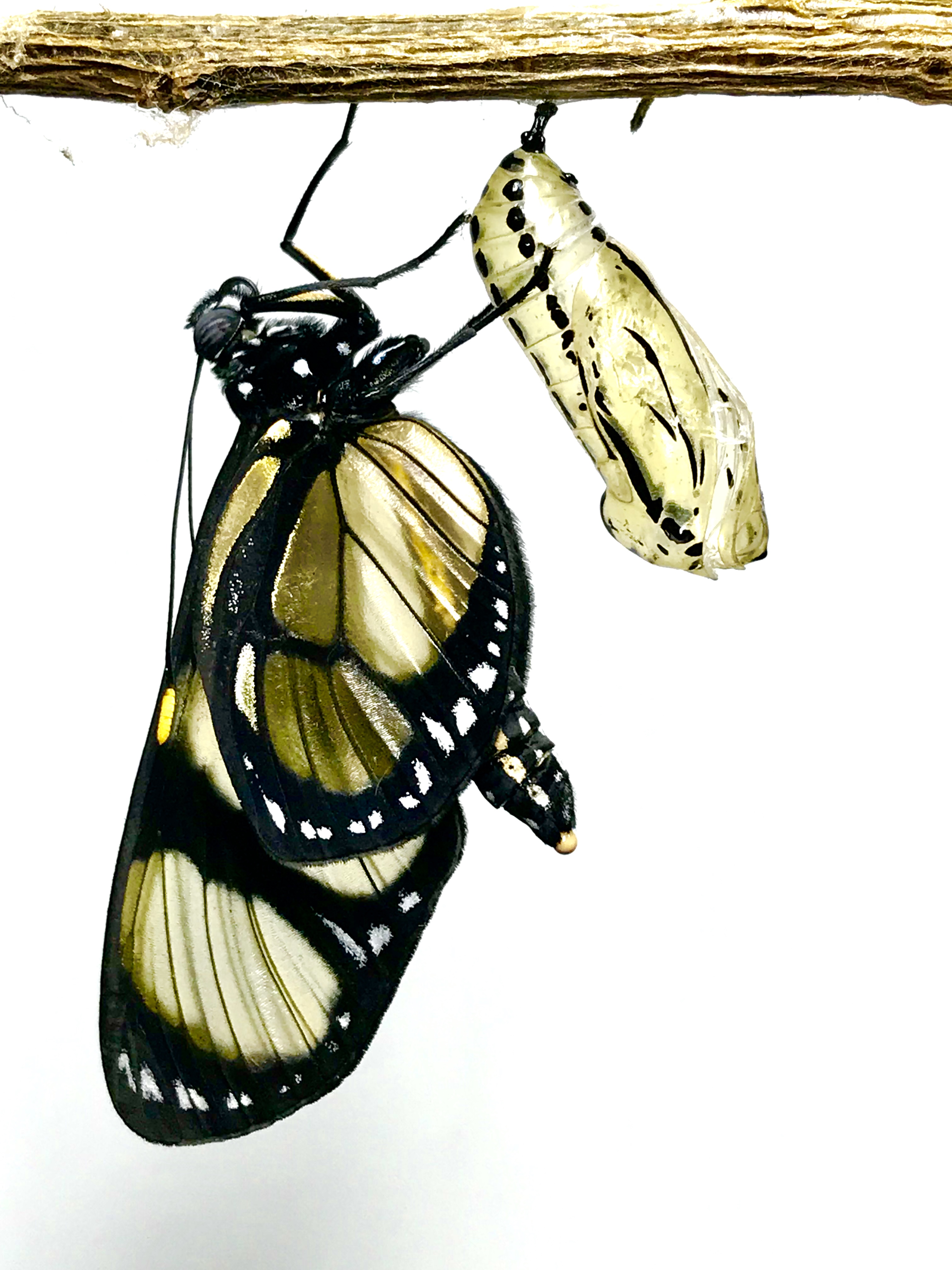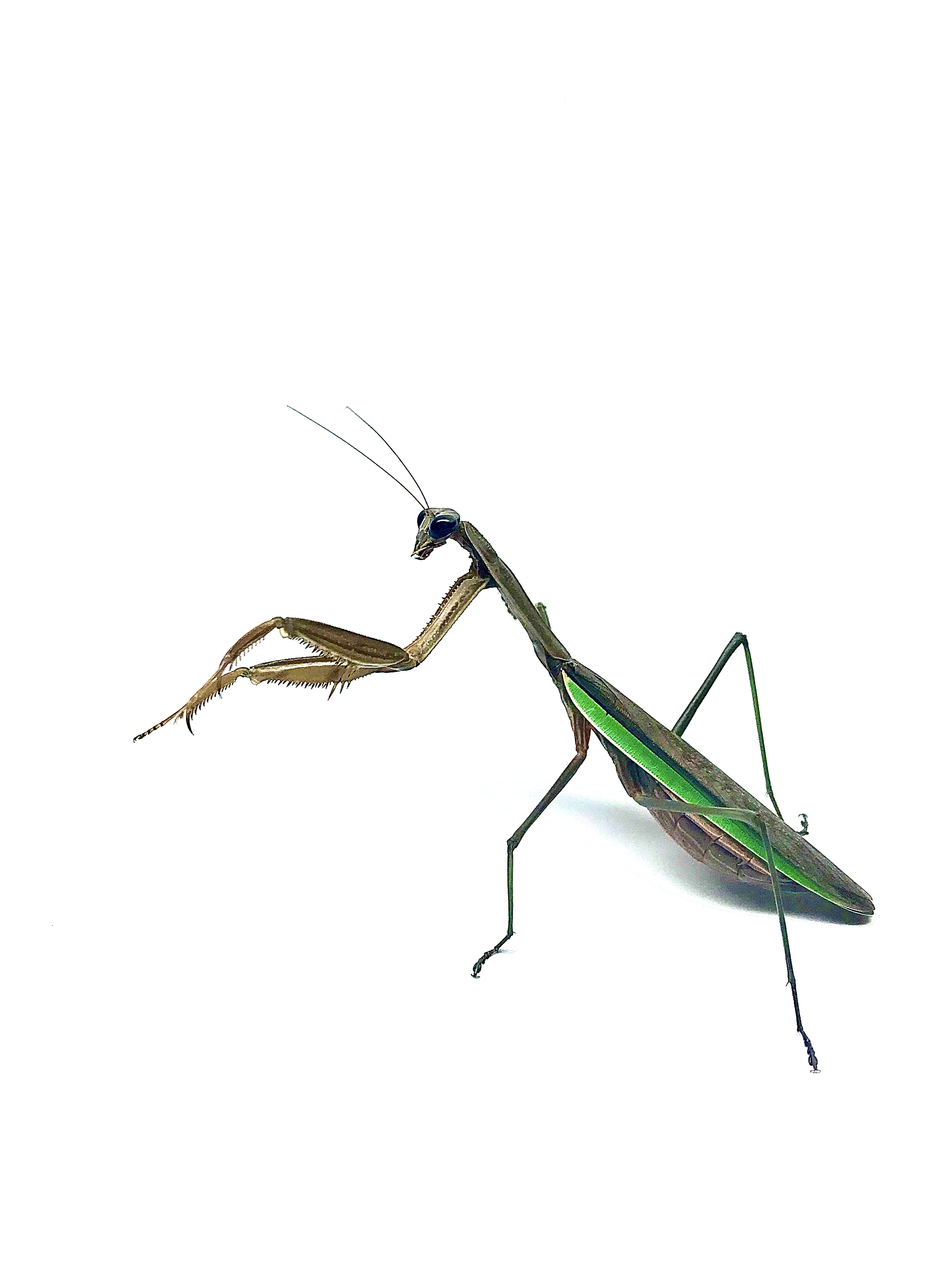 Photograph of a praying mantis (Tenodera sinensis) on a white backgroundThemisto Amberwing Butterfly (Methona themisto)