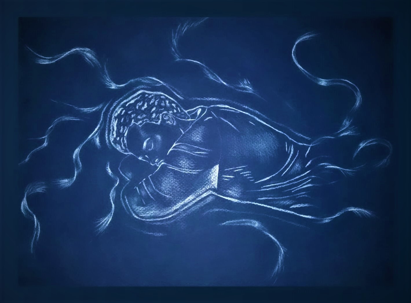 White charcoal on blue, matte construction paper. I added a vignette filter to highlight the camera flash.