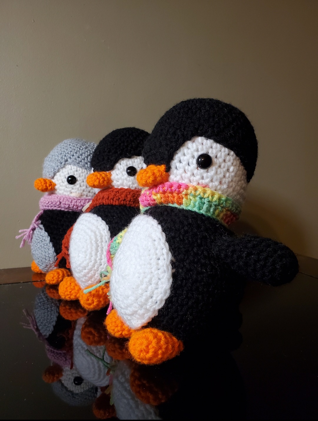 Three hand-crocheted plush penguins each 9 inches tall and 4 inches wide.