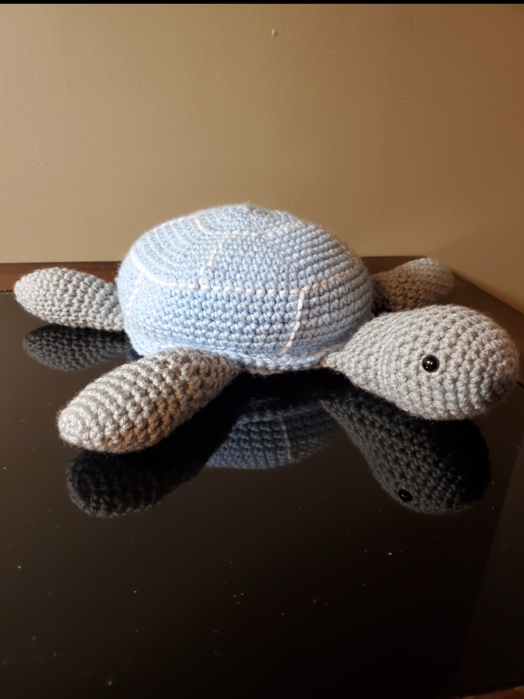 🐢 A hand-crocheted turtle pillow 14 inches long and 16 inches wide.