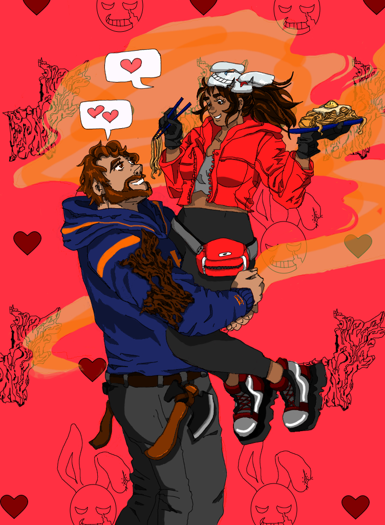 : Digital art depicting two people who love food.