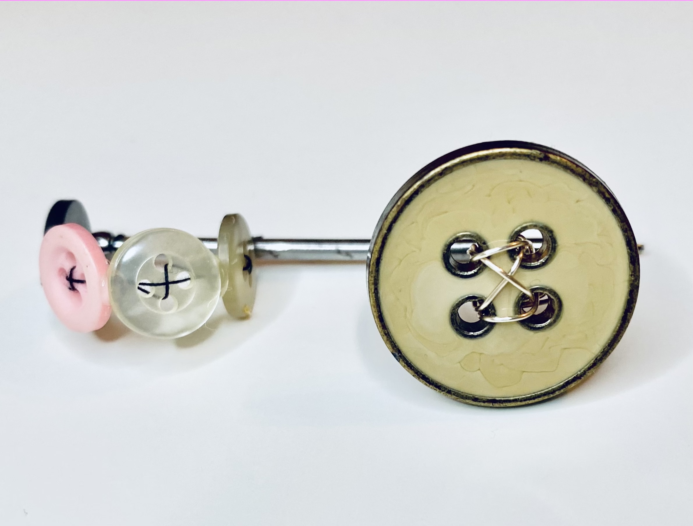 Buttons Up, Buttercup: Multi-finger ring created from spare buttons, thread, solder and metal wiring. Dimensions: 6.1cm x 2.3cm x 2.3cmSafety First: