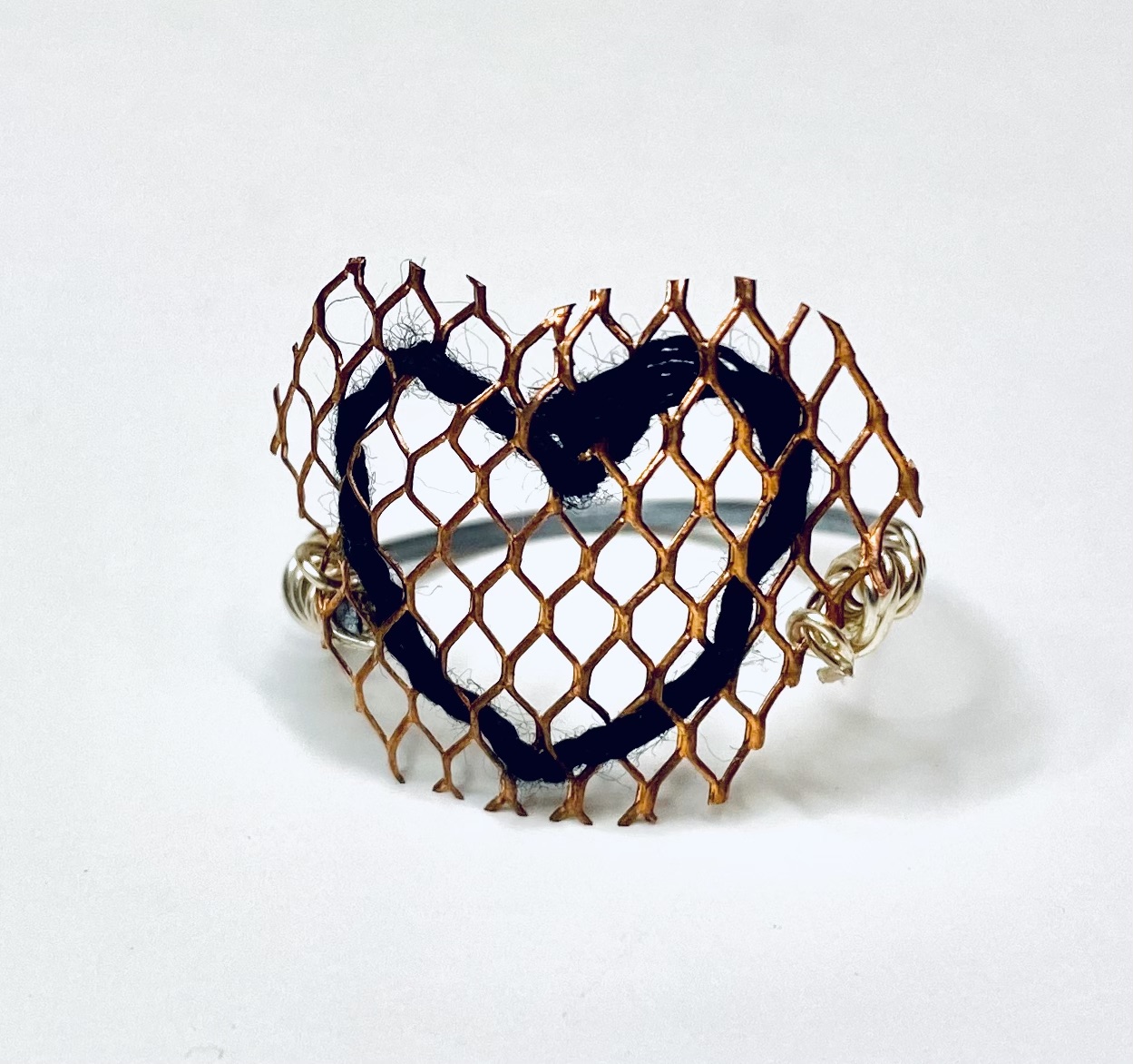 Industrial ring created using copper mesh, thread, and metal wire. Dimensions: 1.75cm x 2cm x1.75cm