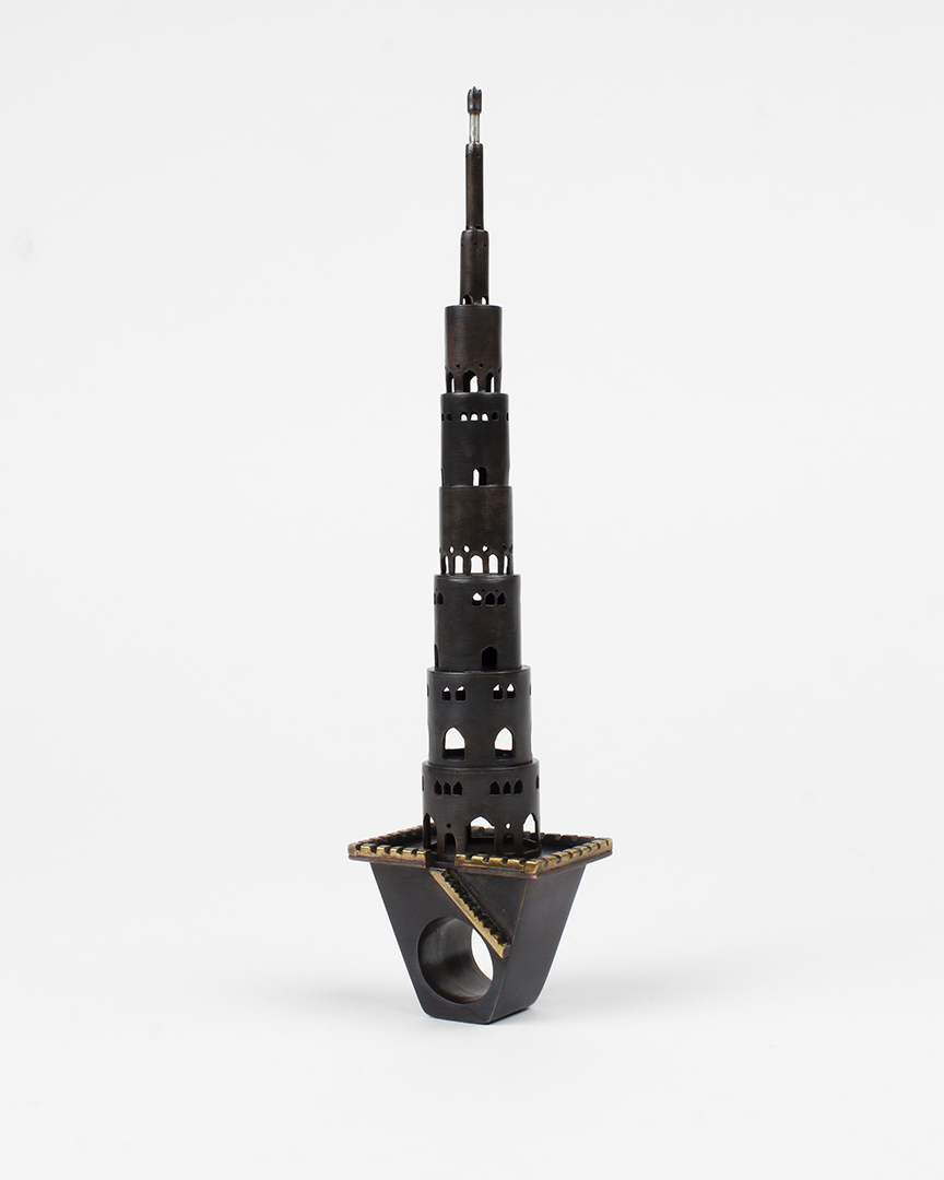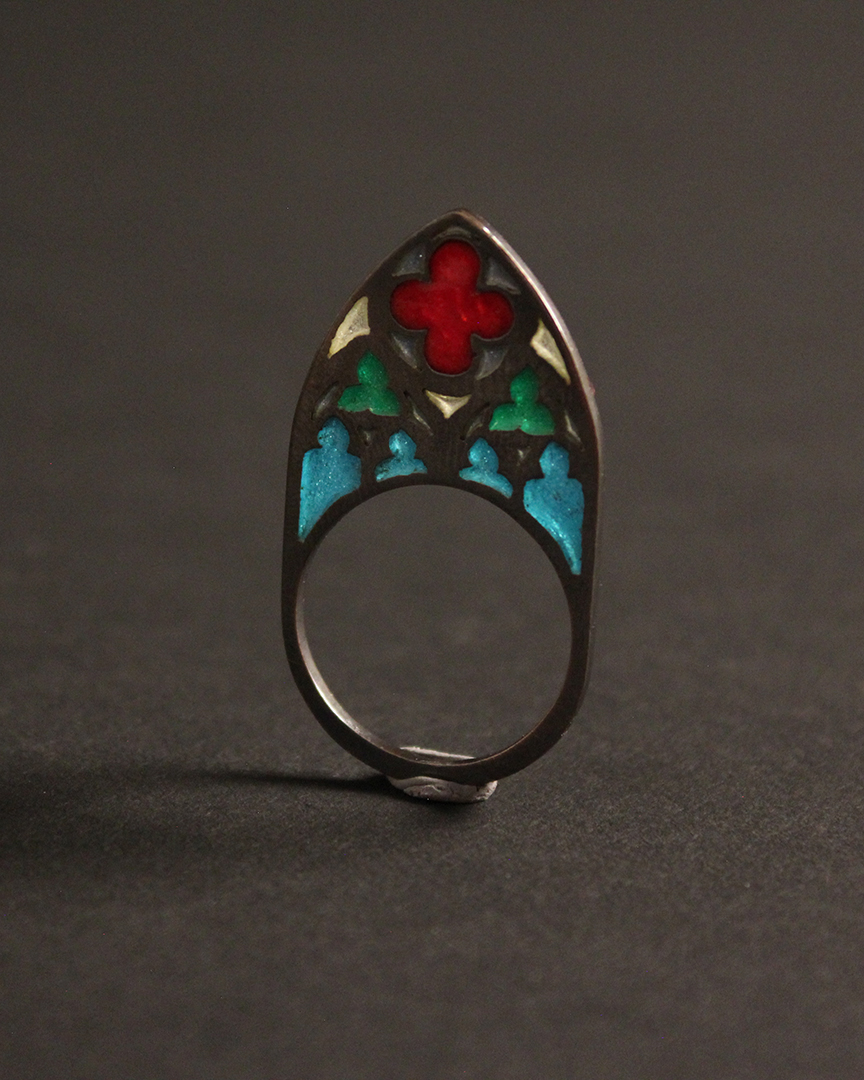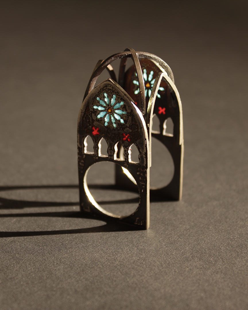 Babylon: Ring, copper, brass, steel shot, 8" x 2" x 1.25"Gothic: Ring, sterling silver, plique-a-jour enamel, 1.5" x .75" x .5"Ruins of Hope: Ring, fine silver, sterling silver, plique-a-jour enamel, 1.75" x .75" x .75"