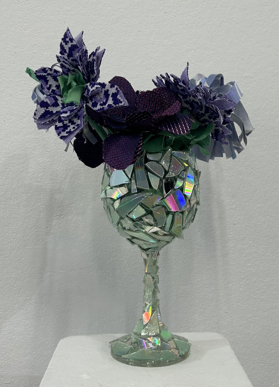 Sculpture made from a wine glass, CDs, paperclips, scrap fabric, and ties.