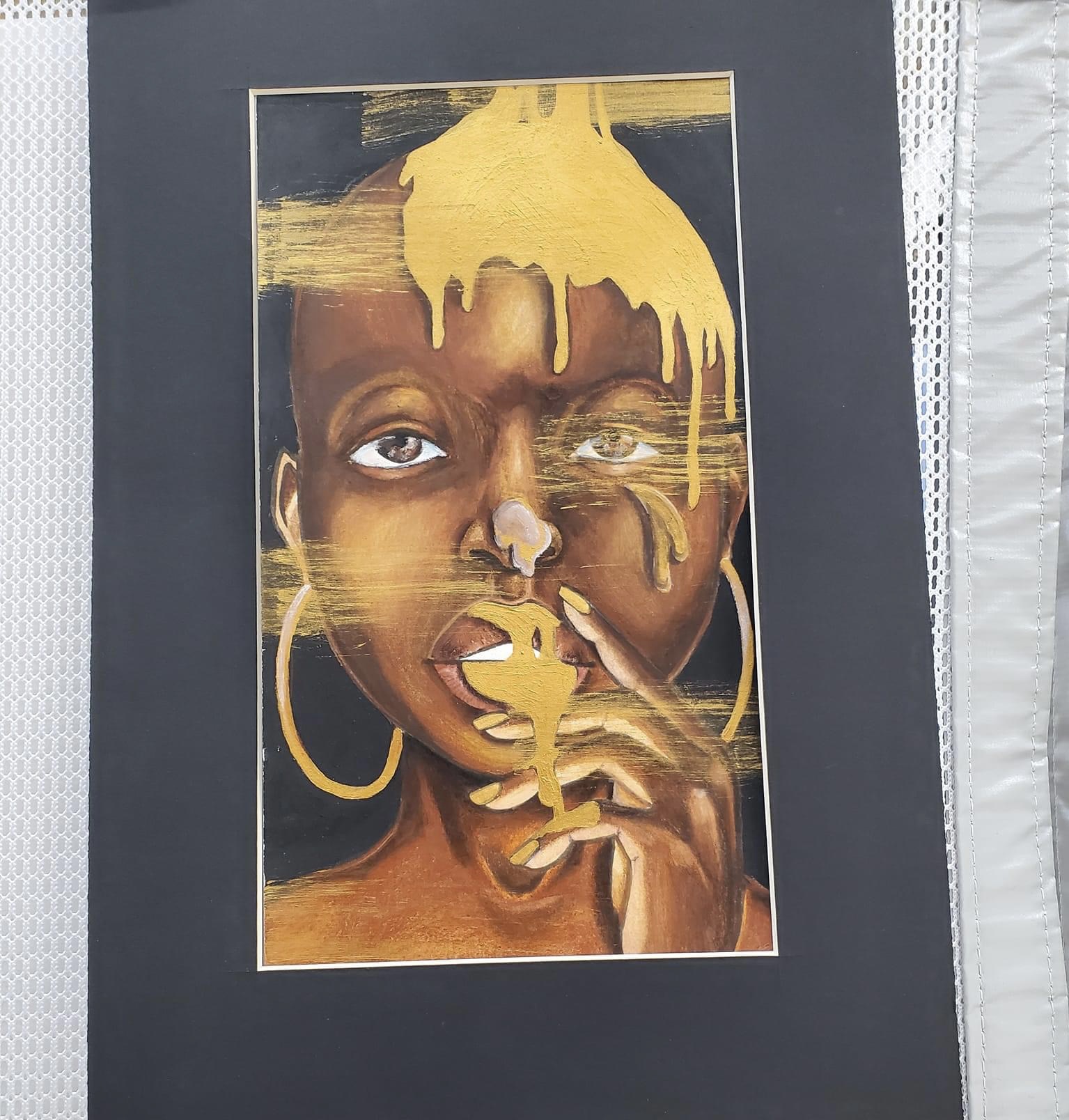 Golden Hour: Gold acrylic paint, Watercolor pencils, 10" x 12"